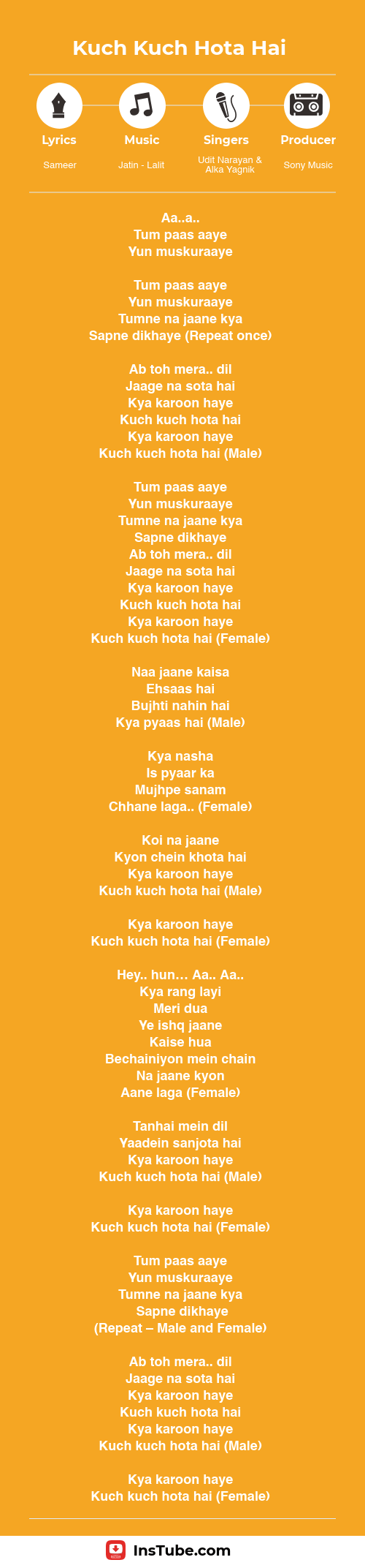youtube chanel ;https://www.youtube.com/channel/UCwVueZZ94Yu-6NBb1JwPItw facebook . Kuch Kuch Hota Hai Lyrics are a subject that is being searched for and liked by netizens now. You can Download the Kuch Kuch Hota Hai Lyrics here. Download all royalty-free pic. Kuch Kuch Hota Hai Lyric Video - Title Track|Shahrukh Khan,Kajol,Rani Mukerji|Alka Yagnik, Sing Along to the title track of the film 'Kuch Kuch Hota Hai', composed by Jatin Lalit and sung by Udit Narayan and Alka Yagnik .